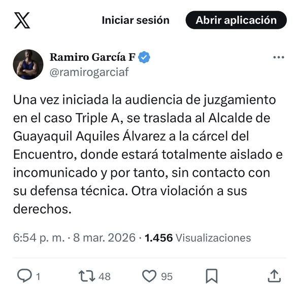 Ramiro García, abogado de Aquiles Alvarez, confirmó el traslado de su defendido. "Una vez iniciada la audiencia de juzgamiento en el caso Triple A, se traslada al Alcalde de Guayaquil Aquiles Álvarez a la cárcel del Encuentro, donde estará totalmente aislado e incomunicado y por tanto, sin contacto con su defensa técnica. Otra violación a sus derechos", escribió García en sus redes sociales.