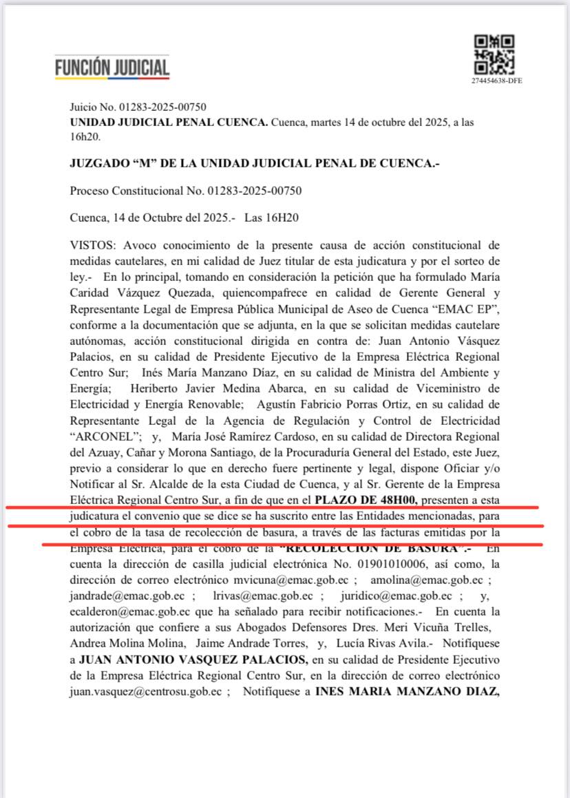 Sobre las medidas cautelares solicitadas por la EMAC Ep para que no se suspenda el cobro de la Tasa de Recolección de Basura en las facturas emitidas por la Empresa Centrosur, el Juez Cayetano Serrano respondió a la empresa municipal que: “presenten a esta Judicatura el convenio que se dice se ha suscrito entre las entidades mencionadas”. Para esto dió un plazo de 48 horas.